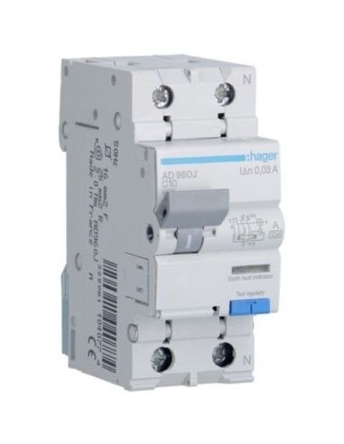 Srovės nuotėkio relė su automatiniu jungikliu Hager AD960J (2P, 10A, A tipo, 30mA, 230V)