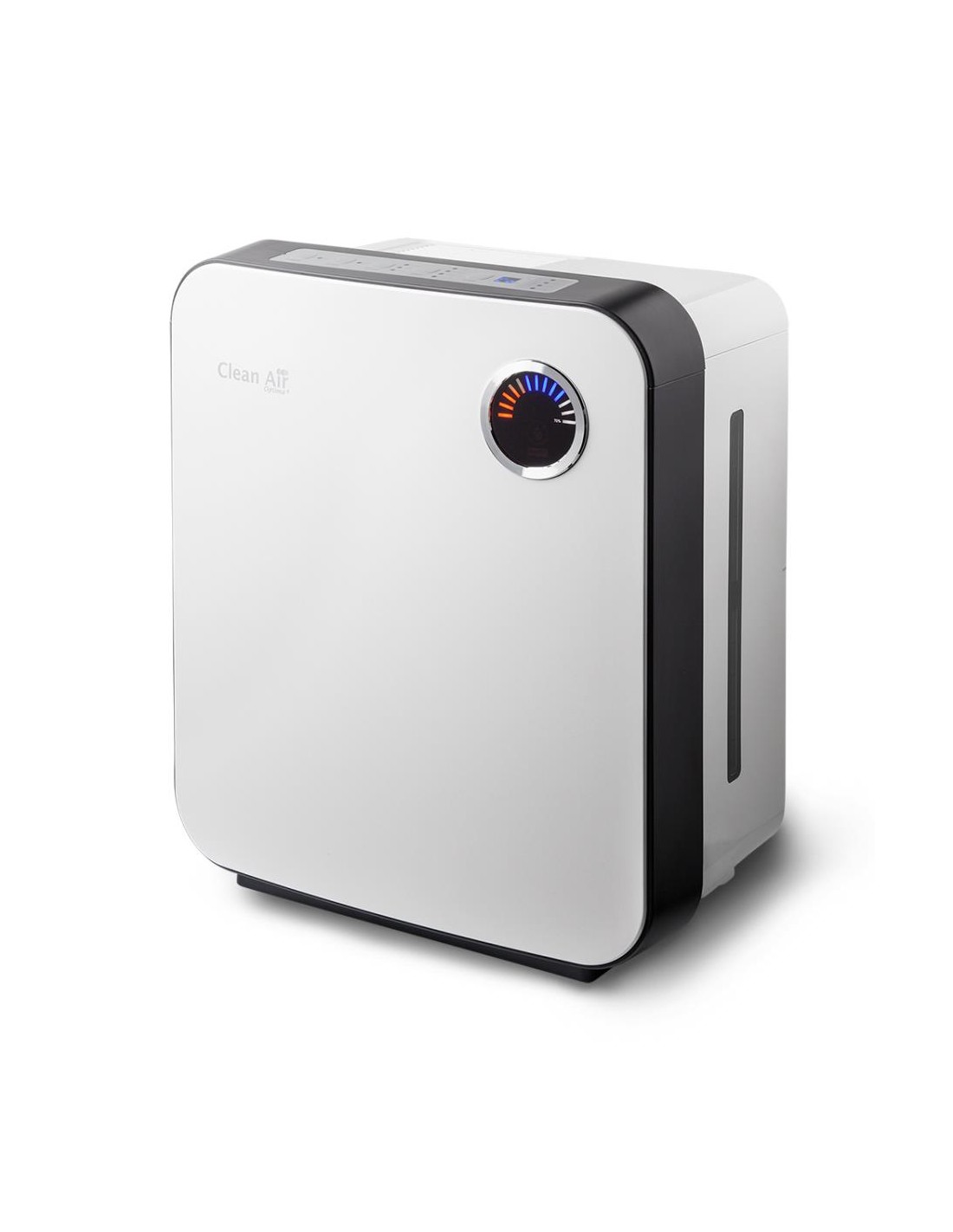 The unique air washer CA-807 does not only purify indoor air, but simultaneously emits humidified air. A fan aspires unclean and dry air which is first conducted through the activated carbon prefilter and then guided through the rotating humidification disks with scoop ribs. Prefiltered air is naturally washed and purified comparable to a rain shower or a waterfall. The smallest particles up to 10 micrometers are bound and separated. The system functions without filter pads and is particularly hygienic because of the antimicrobial water filter. Further attributes: digital control of air humidification, easy operation and maintenance, uncomplicated, high performance, very silent.