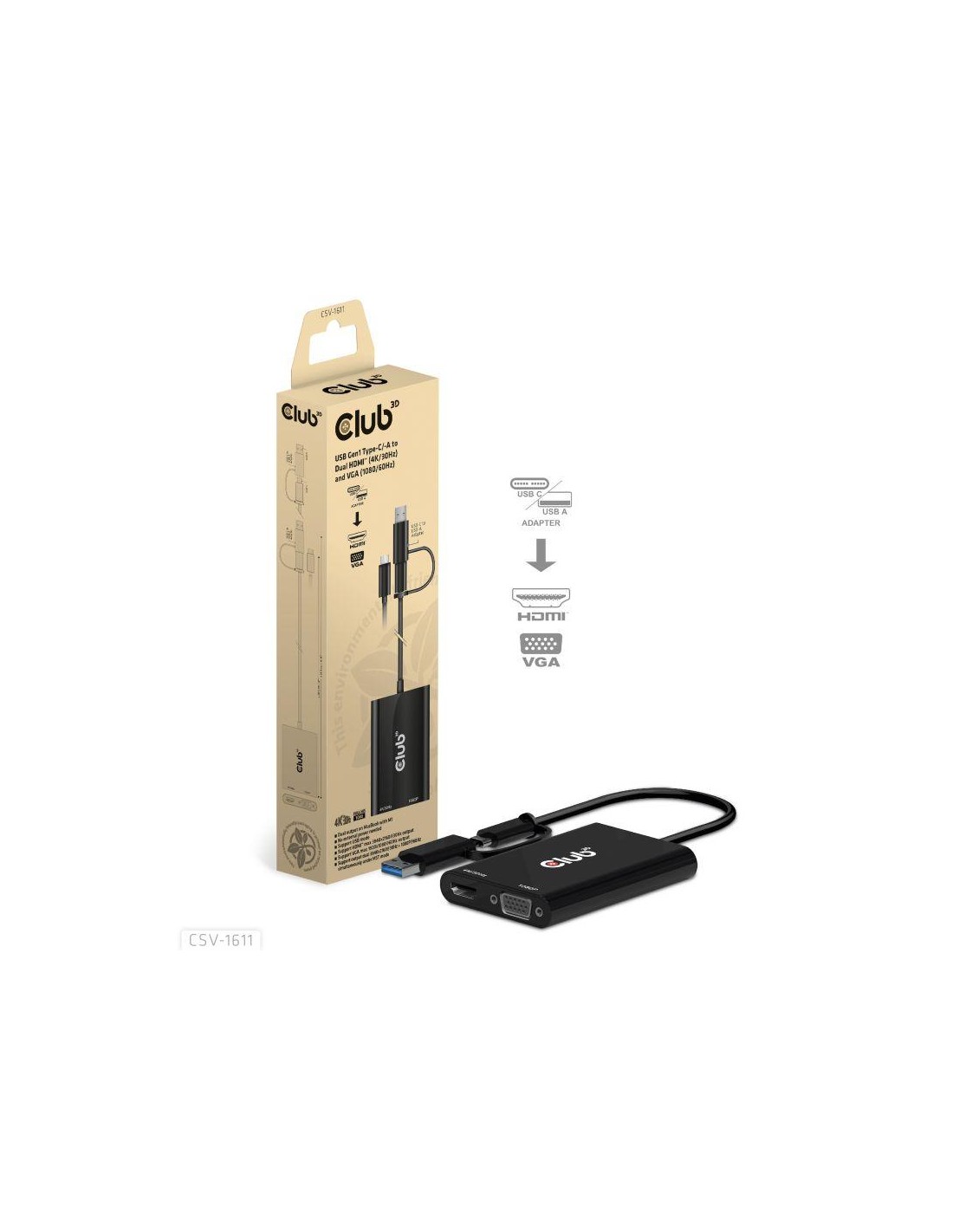 The Club 3D CSV-1611 USB Gen1 Type-C/-A to Dual HDMI™ (4K/30Hz) and VGA (1080/60Hz) adapter is a Dual Display adapter which provides most advanced, efficient solution to extend a single USB Type-C or Type-A port to HDMI™ and VGA displays. It supports single HDMI™ 4K/30Hz and VGA 1080P/60Hz or dual 4K/30Hz + VGA 1080P/60Hz simultaneous output of different videos. It can work on USB Mode and DP Alt mode supported Type-C and USB-A host. Dual Video output on MacBook with M1. Support USB Gen1 with max 5Gbps data transmission. The unit is powered thru the USB Type-A or Type-C host connection. No external power needed.