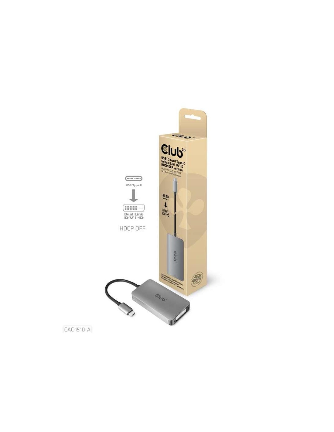 The Club 3D CAC-1510-A is a USB3.2 Gen1 Type-C input to Dual Link DVI-D or Single Link DVI output adapter HDCP OFF version for Apple Cinema Displays or other displays which do not support HDCP.