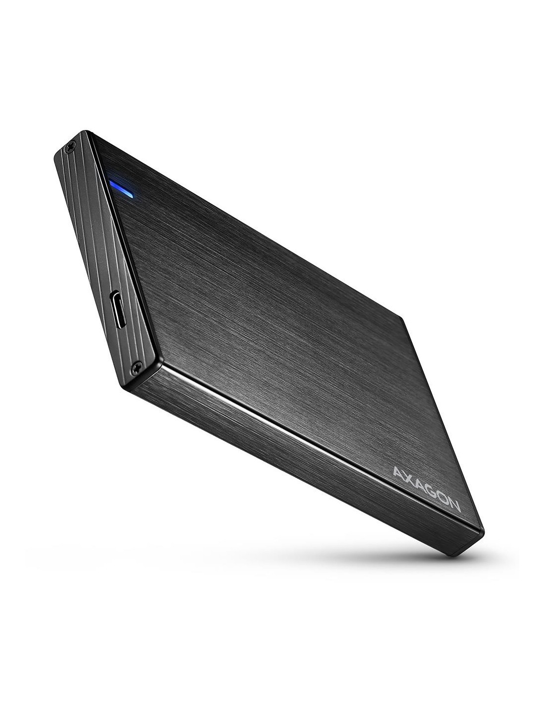 Compact aluminum external AXAGON EE25-XA6C ALINE box with USB-C 5Gbps interface for 2.5” SATA HDD or SSD. The double-sided USB-C connector on the box together with the supplied USB-C -> USB-A cable enables a reliable connection to a computer.