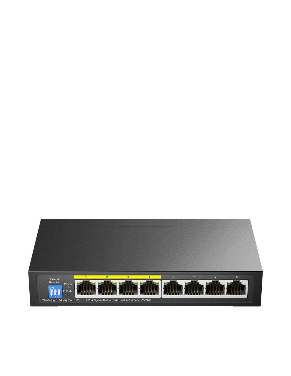 - Extend ModeExtends PoE on ports 1–4 up to 250 m at 10 Mbps