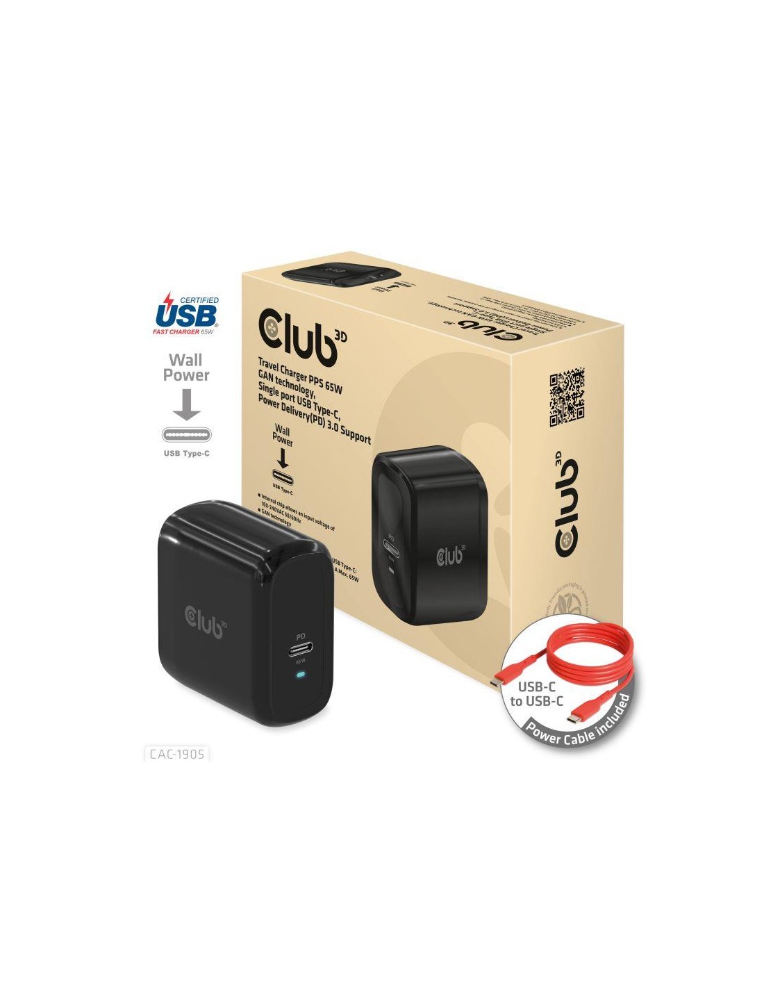 CLUB3DTravel Charger PPS 65W GAN technology, Single port USB Type-C, Power Delivery(PD) 3.0 Support