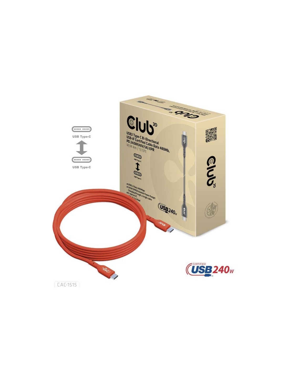 The Club 3D CAC-1515 USB2.0 Type-C Bi-Directional USB-IF Certified Cable, Data 480Mb, PD 240W(48V/5A) EPR, Extended Power Range M/M 4 m / 13.13 ft connects your Notebook, Tablet or Phone with USB Type-C output to your favorite existing Peripherals, Accessories and Chargers. It enables Data and Power over a single cable and both ways. This cable supports USB2.0 data up to 480Mbps and up to 240Watt(48V/5A) output for Downstream charging or powering your Notebook, Tablet or Smartphone.