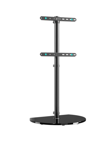 - Practicality: The TV stand allows you to free up space under the TV and give a more modern touch to the interior. The height of the TV can be adjusted up to 122 cm. The TV stand set includes protective pads that prevent scratches on the back of the TV. The 10mm tempered glass base offers a stability of the TV swivel stand.