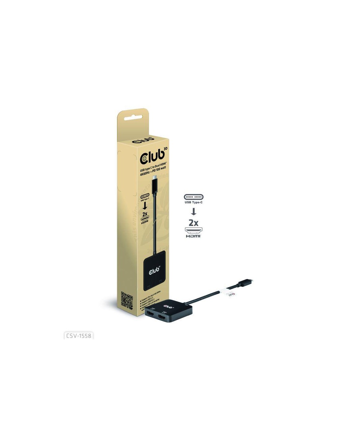 The Club 3D CSV-1558 USB Type-C to Dual HDMI™ 4K60Hz + PD 100 Watt Charging under DP1.4 Alt mode, allowing to extend the USB Type-C port of the host to 2x HDMI™ displays with ultra high definition max 4K60Hz for each display simultaneously. Supporting MST function, dual displays can be showed with different video contents simultaneously. Besides, it supports PD Charging with max 100 Watt. It can work on all DP™ Alt mode supported USB Type-C or Thunderbolt™ devices (including Phones with an USB Type-C connetion and DP™ Alt modesupport).