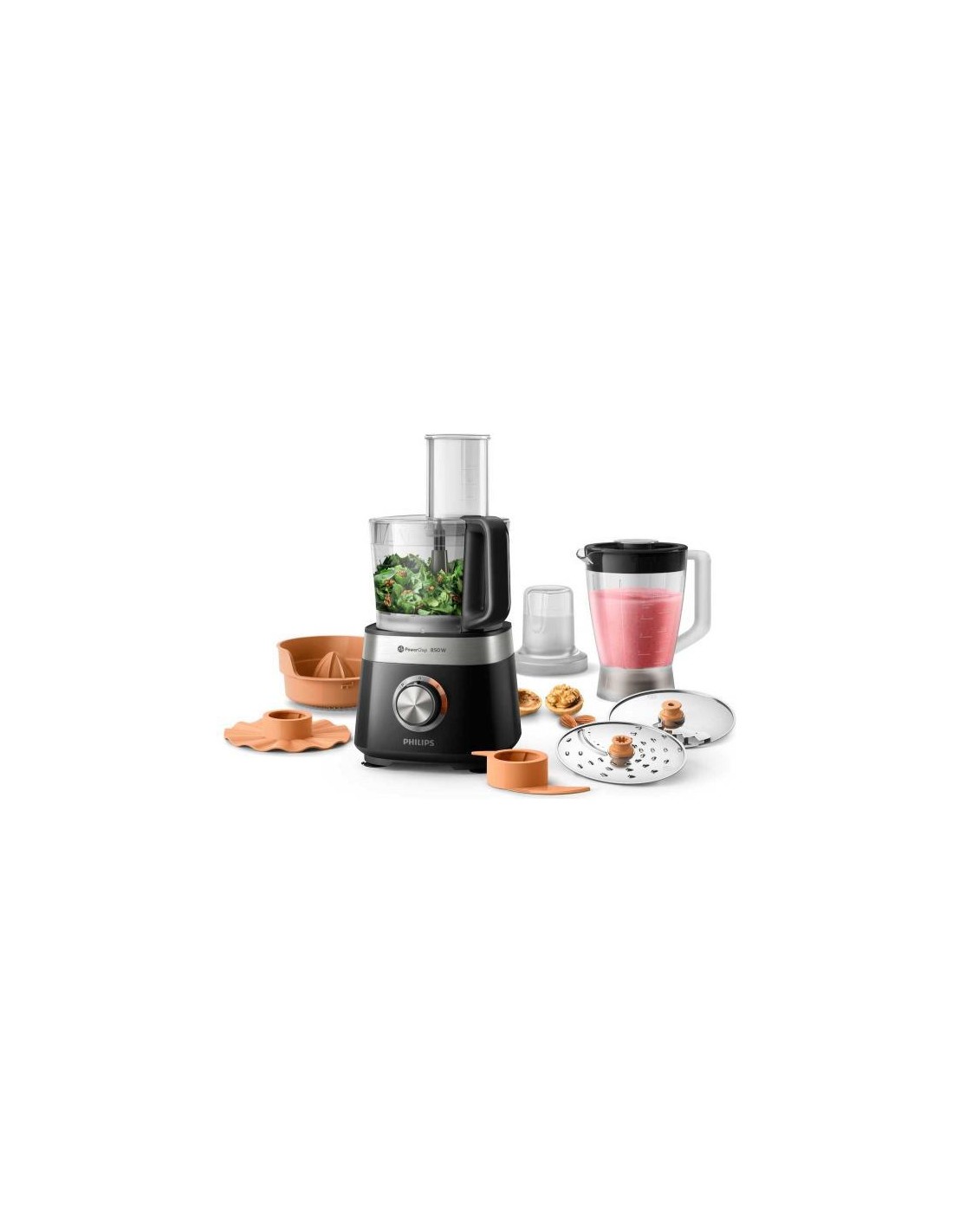 - S-shaped knife block, Citrus juicer, Whipping nozzle, French fries cooking disc, Pitcher, Dough kneading nozzle, Mill, Double-sided disc, Storage container